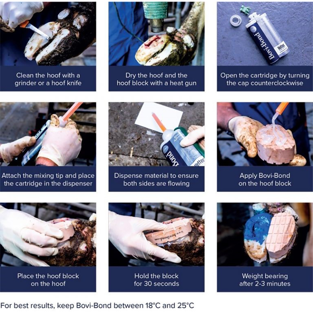The block should be removed after 4-6 weeks, by which time, if you repaired it correctly, the affected claw should have made a full recovery. Bovi-Bond adhesive sets in approximately one minute after application. It can be load-bearing after 2 or 3 minutes (or slightly longer in cold weather).