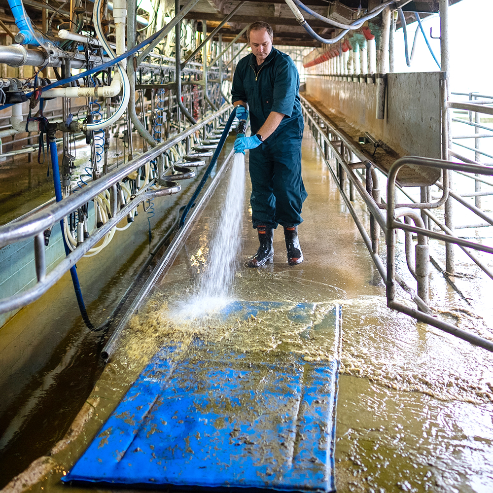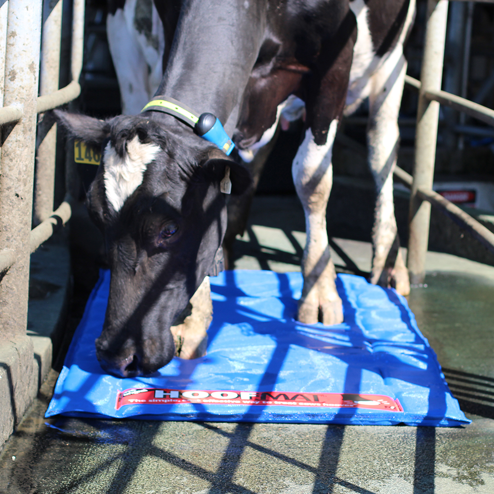 We advise using Hoofmats at the ENTRANCE to the milking platform (herringbone dairies will require two). This ensures that the treatment solution has adequate time to work - cows have their feet treated before standing quietly being milked. Hoofmats do not require securing to the floor. Simply place where required and pour on the remedy of your choice before commencement of milking. Top up the Hoofmats after 80-100 cows, or as required during milking.