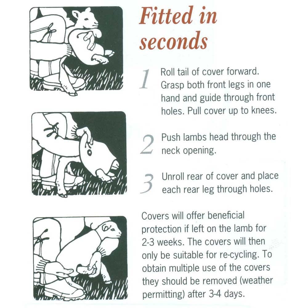 Developed by New Zealand sheep farmer, Mr David Brown, in the early 1990s. For management reasons lambing is most often carried out at a time of the year subject to adverse conditions, putting survival of many lambs at risk. Lamb mortality can be dramatically reduced. Not only are survival rates increased, but trials have proven lambs in Woolover covers gain 2/3 of a kg more weight in their first three weeks compared to uncovered lambs. The reduced feed demand on the ewe ensures she does better too. Woolover covers should be applied to all lambs under 4 days old when a storm is imminent. It is recommended that covers are left in place for up to 3 weeks (remove at docking time) to get maximum benefit, but if there is substantial improvement in the weather, covers can be removed and re-used for greatest economy. Woolover covers can be applied in about 30 seconds. The tail end is rolled forward and the lamb’s front legs, and then head, are inserted through the front holes (just like putting on a jersey). The tail end is then unrolled and the rear legs pulled through the holes. Care should then be taken to pull the cover up all the legs so it is snug against the lamb’s body. Survival is then assured in even very bad weather conditions. Woolover covers can be washed and re-used if removed after 3-4 days. Covers should not be left on lambs for longer than 3 weeks, except for exceptionally small lambs.